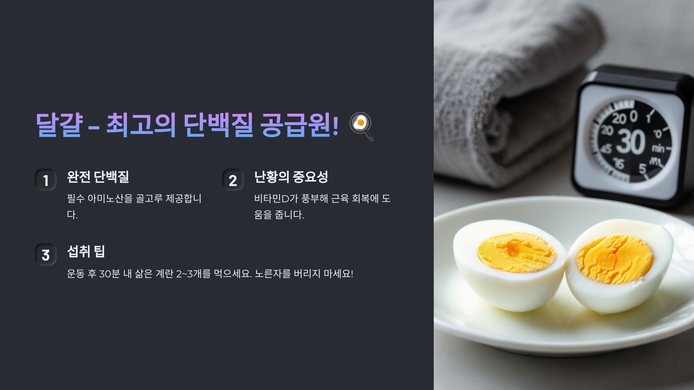 👉 운동 후 30분 내로 삶은 계란 2~3개 먹으면 회복에 도움!